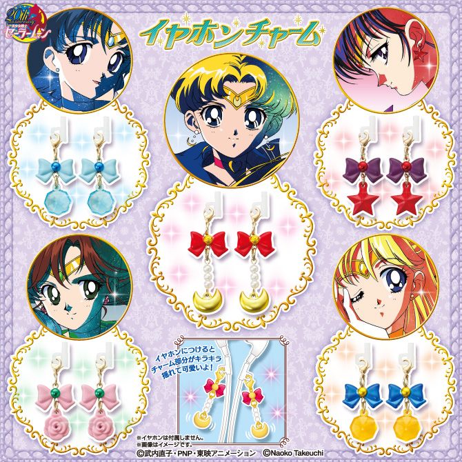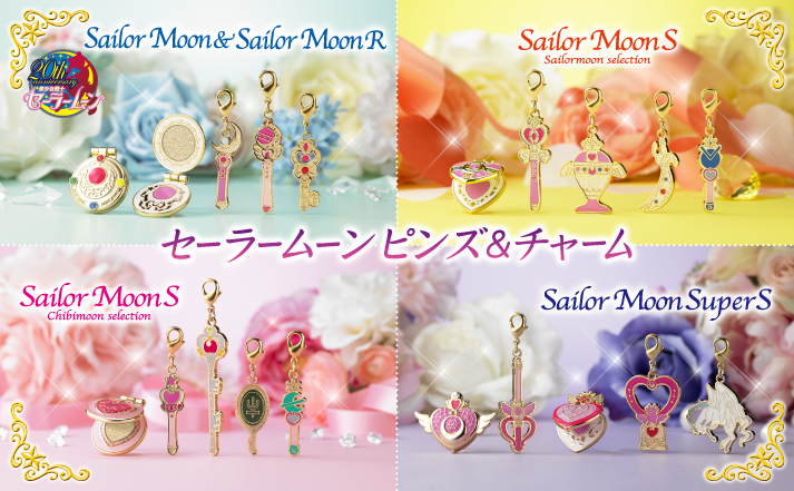 seriom R, S (dwa zestawy, jeden poświęcony Sailor Moon, a drugi Sailor Chibi Moon) i Super S. W sumie w zestawach znajdzie się 6 przypinek, które są broszkami do przemiany i otwierają się oraz 14 zawieszek. Przy zakupie pełnego zestawu