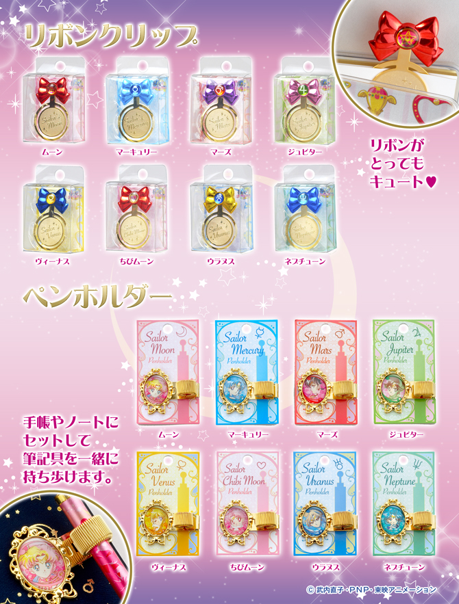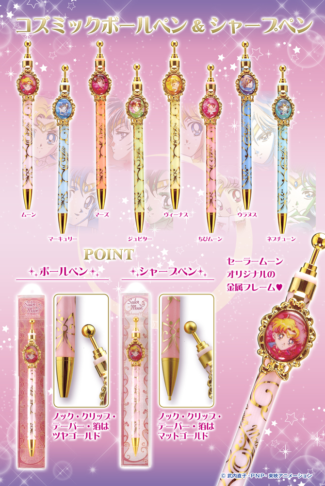 Zestawy długopisów i ołówków automatycznych. W zestawach dostępnych jest 8 sztuk, każda sztuka odpowiada innej wojowniczce od Moon do Neptune, łącznie z Chibi Moon. Długopisy mają złote wykończenie z połyskiem, a ołówki matowe. Cena za sztukę to 750 jenów