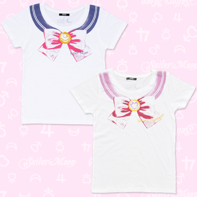 Kolejne są koszulki we wzorach, które występowały już wcześniej, z nadrukiem kołnierzyka i kokardy Sailor Moon i Sailor Chibi Moon. Cena za sztukę to 3240 jenów (ok. 99 zł).