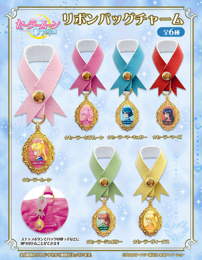 W sprzedaży pojawią się kolejne zawieszki do toreb, tym razem zapinane na zatrzask. Do wyboru będzie sześć wzorów, każdy z inną inner senshi oraz Chibi Moon. Pasek z imitacji skóry będzie miał wymiary 160 x 14 mm, a sama zawieszka jest długości 40 mm.