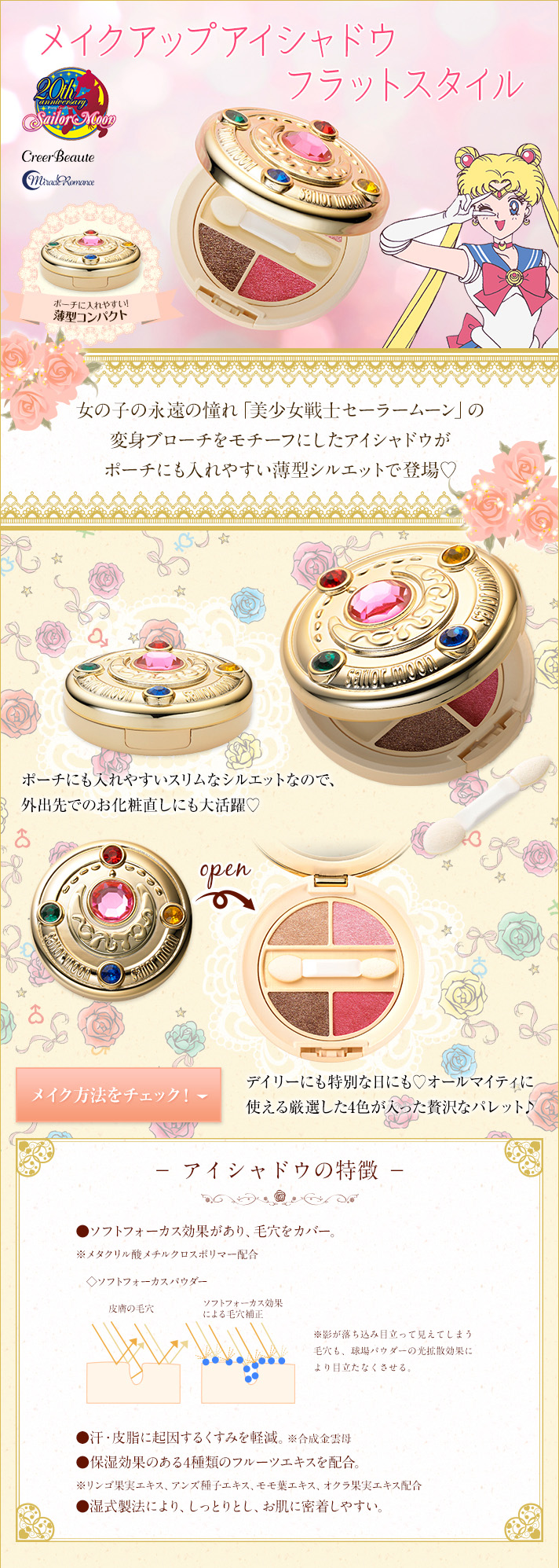 W sprzedaży pojawi się paletka z czterema cieniami do powiek w formie broszki do przemiany Sailor Moon. Cienie zawierają syntetyczny flogopit (minerał), dzięki któremu kolory cieni są wyraźniejsze po nałożeniu na skórę. Dla nawilżenia cienie zawierają ekstrakty z jabłka, moreli, liści brzoskwini i okry. Paletka ma wymiary 7x 2,5 cm. Przedsprzedaż rozpoczyna się dzisiaj, a wysyłka nastąpi w marcu. Cena to 4212 jenów (ok. 151 zł).