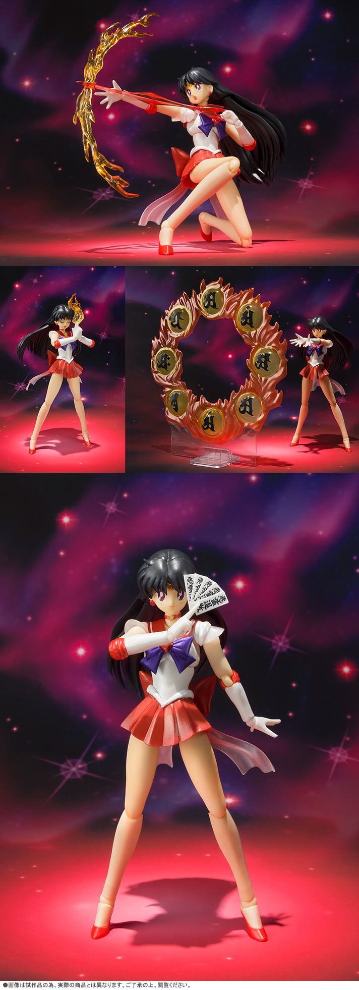 do przemiany Crystal Change Rod, płomyk do ataku Fire Soul, łuk do ataku Mars Flame Sniper, ognisty krąg do ataku Burning Mandala, dwa rodzaje ofudy, dwie podstawki (pod figurkę i pod Burning Mandalę).