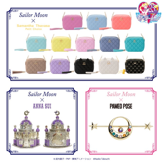 łańcuszkami na ramię; do wyboru wzory Crystal Star Compact, Deep Aqua Mirror, Eternal Sailor Moon i Chibi Chibi; dwie pierwsze są w cenie 9180 jenów za sztukę (ok. 289 zł), a pozostałe dwie w cenie 7344 jenów za sztukę (ok. 321 zł). -
