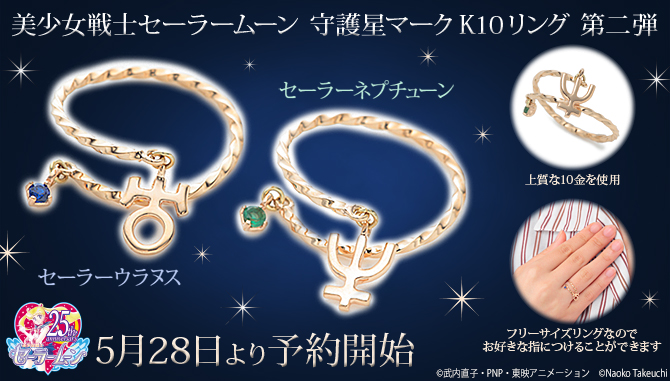 W sprzedaży pojawią się regulowane pierścionki ze znakami planet. Pierścionki są pokrywane 10-karatowym złotem i ozdobione syntetycznymi kryształkami. Do wyboru wersja Sailor Uranus lub Neptune. Przedsprzedaż rozpoczyna się dzisiaj, a wysyłka nastąpi