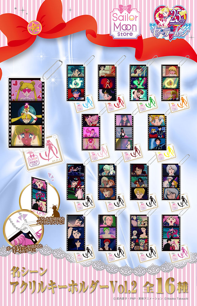 a na brelokach pojawiają się sceny z serii Sailor Moon i Sailor Moon R. W sprzedaży pojawią się 6 października w Sailor Moon Store w cenie 864 jeny za sztukę (ok. 29 zł). W przyszłości planowana jest też sprzedaż zestawu zawierającego