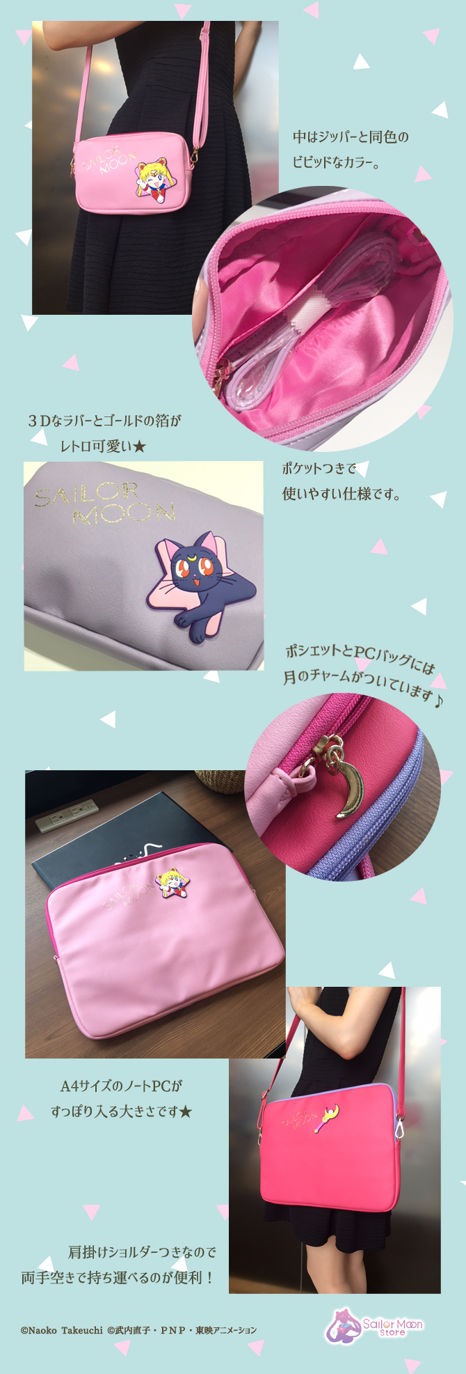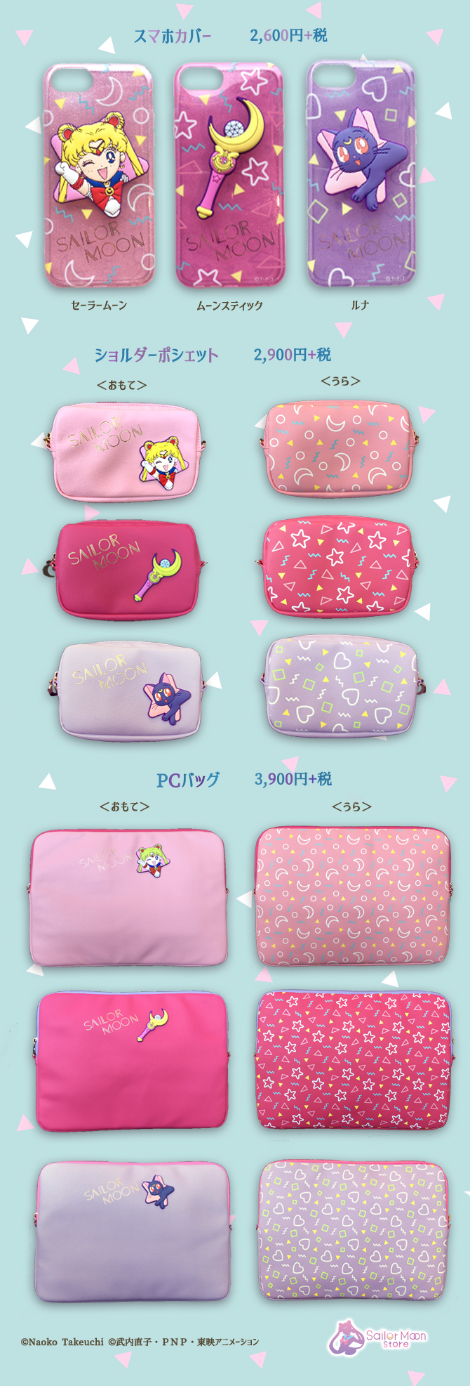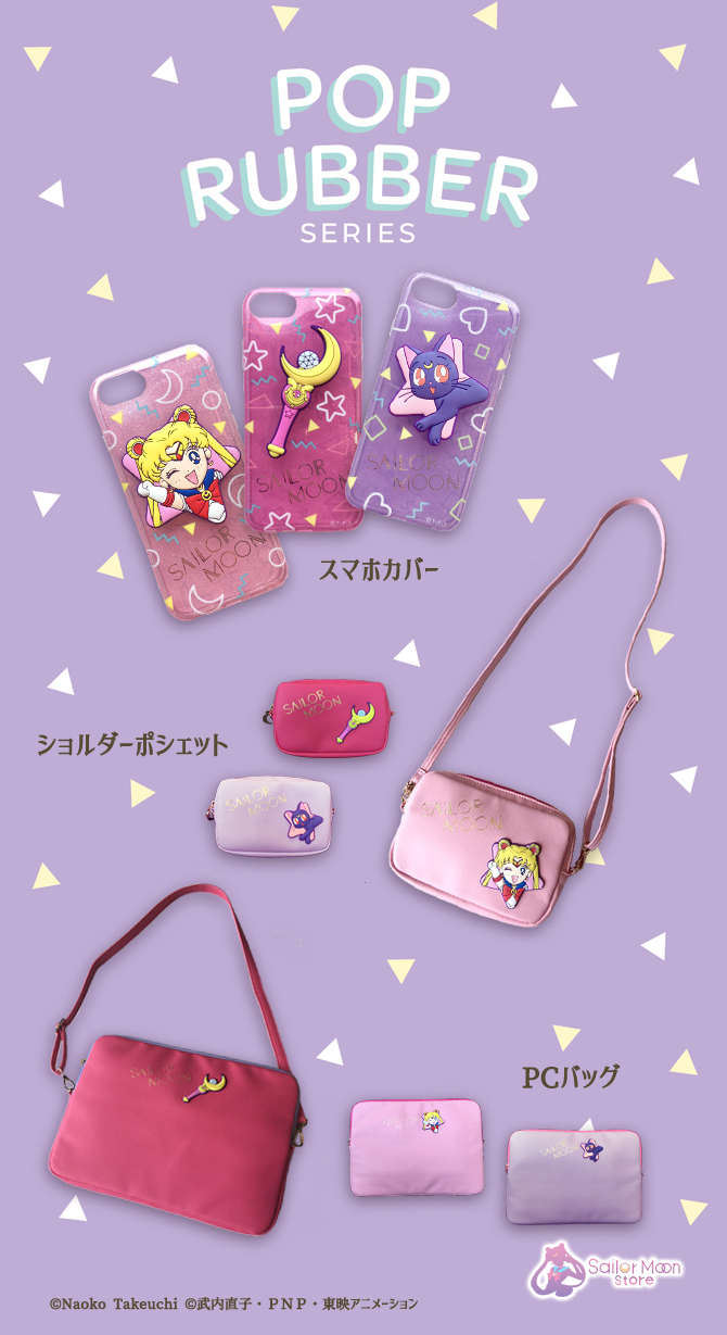 W Sailor Moon Store pojawią się gumowe akcesoria, etui na smartfona, torba na ramię oraz torba na laptopa w odcieniach różu i fioletu. Dostępne są wzory z Sailor Moon, Moon Stick oraz z Luną. Etui dostępne są na iPhony 6/6s/7/8 i kosztują 2808 jenów za