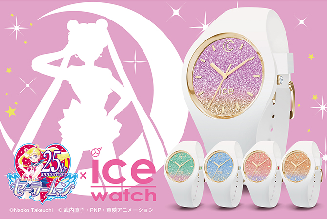 We współpracy z Ice Watch pojawią się białe zegarki kwarcowe z kolorowymi tarczami. Do wyboru są tarcze w 5 wersjach kolorystycznych inner senshi. Tarcze są dwukolorowe i połyskujące, jeden kolor stopniowo przechodzi w drugi. Paski są białe, wykonane