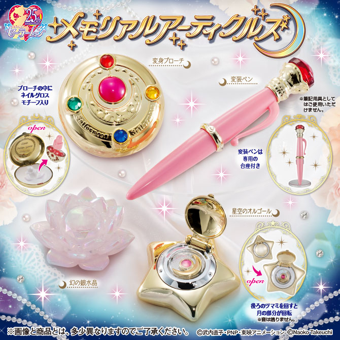 Składane lusterka w formie magicznych przedmiotów. Do wyboru: Crystal Star Compact (14 x 14 cm), Cosmic Heart Compact (17 x 15,5 cm), Crisis Moon Compact (18 x 26 cm), Eternal Moon Article (17 x 23 cm), Holy Moon Chalice (23 x 18 cm) oraz Sailor Star