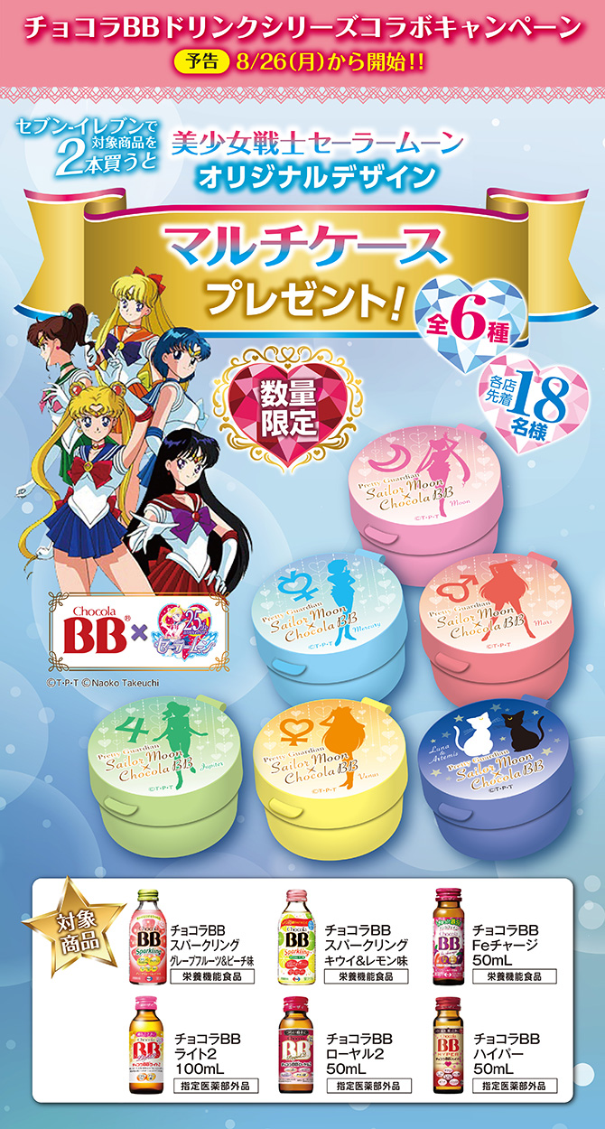 26 sierpnia rozpocznie się nowa kampania Chocola BB w sklepach sieci Seven Eleven. Przy zakupie dowolnych dwóch napojów z serii Chocola BB otrzyma się uniwersalny pojemnik do przechowywania. Do uzbierania 6 wzorów, 5 z sylwetkami i w kolorach inner senshi