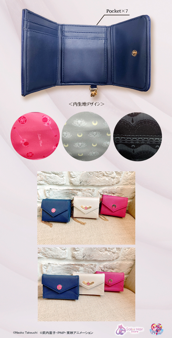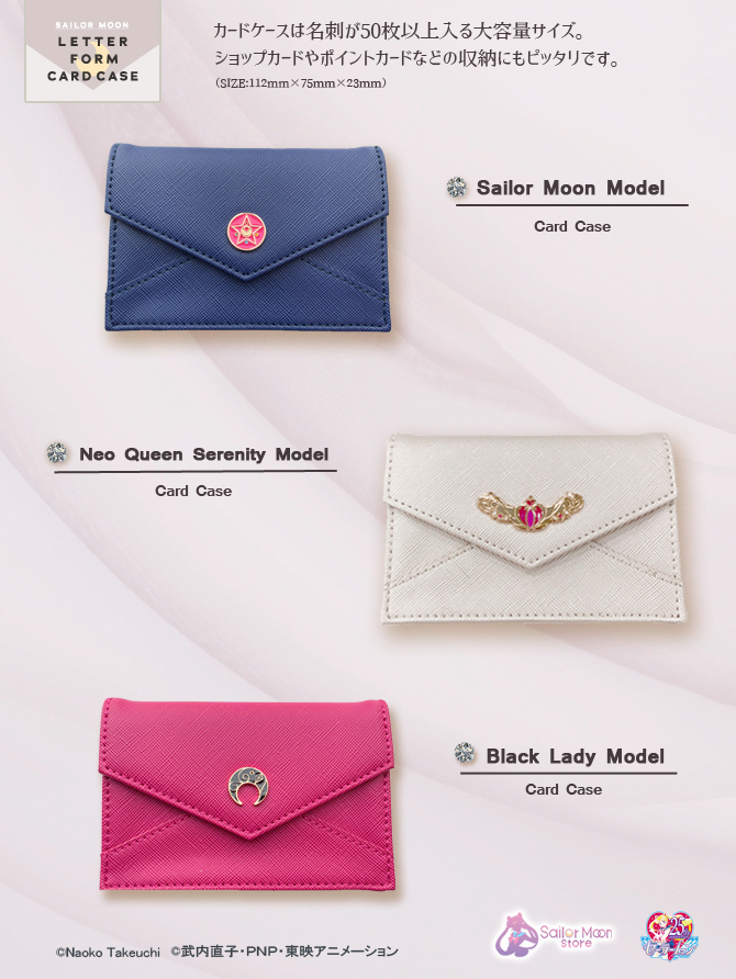 W Sailor Moon Store pojawią się kopertowe portfele i etui na karty. Z każdego artykułu dostępne będą trzy modele do wyboru: Sailor Moon, granatowy z broszką Crystal Star; Neo Queen Serenity, biały z diademem Królowej oraz Black Lady, różowy z odwróconym