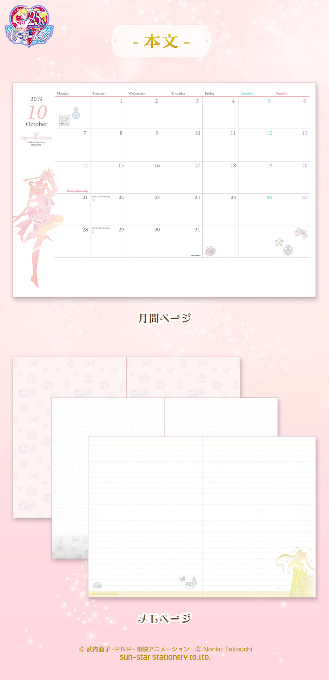 Jeszcze w tym miesiącu pojawią się notatniki z kalendarzem na 2020 rok. Do wyboru jest 5 wzorów: witrażowy, z Księżniczką Serenity, z bibelotami, z Luną i pikowany. Wzór witrażowy ma inner senshi z przodu i resztę wojowniczek z tyłu, winylową okładkę