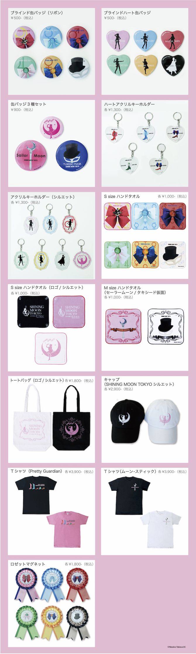 - okrągłe przypinki - 6 wzorów do wyboru, z kokardami inner senshi oraz z maską i cylindrem; 4 cm średnicy; sprzedawane losowo; 500 jenów (ok. 18 zł). - przypinki w kształcie serca - 6 wzorów do wyboru, z sylwetkami inner