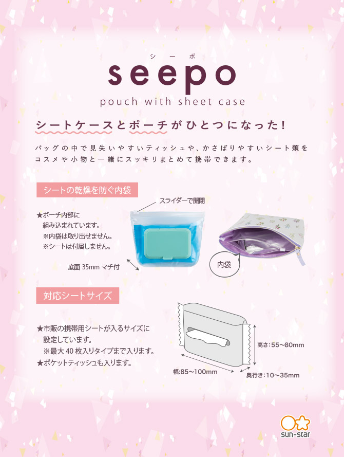 Kosmetyczka seepo z okienkiem - z jednego boku okienko, przez które można wyciągać na przykład chusteczki higieniczne czy do demakijażu; 2 wzory do wyboru; 1980 jenów za sztukę