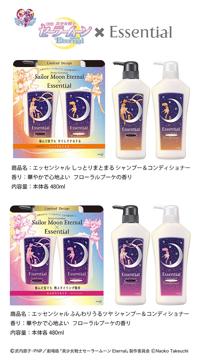 We współpracy z marką Essential pojawią się szampony i odżywki w butelkach z grafiką z filmu Eternal. Na etykietach pojawią się sylwetki Super Sailor Moon oraz Super Sailor Chibi Moon. Do wyboru będą dwa zestawy szampon + odżywka, w wersji nawilżającej