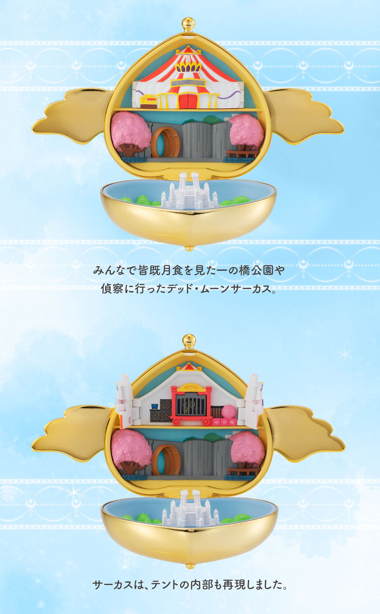 Pojawi się kolejna diorama-miniaturka w broszce, tym razem będzie to broszka Crisis Moon Compact, w której pojawią się lokalizacje związane z filmem Eternal. W środku znajdzie się Park Ichinohashi, namiot Cyrku Martwego Księżyca oraz Elizjum. W zestawie