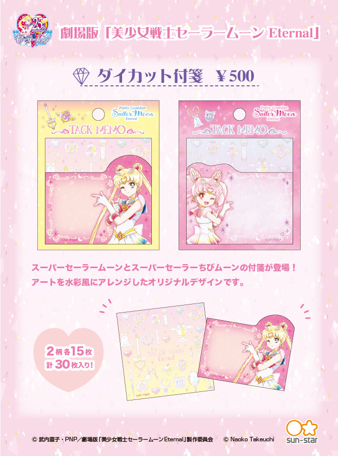Karteczki samoprzylepne ze wzorami z filmu Eternal. Do wyboru są dwa opakowania, z Super Sailor Moon i Super Sailor Chibi Moon. W każdym opakowaniu znajduje się 15 karteczek kwadratowych z magicznymi przedmiotami i 15 karteczek z postacią. W sprzedaży