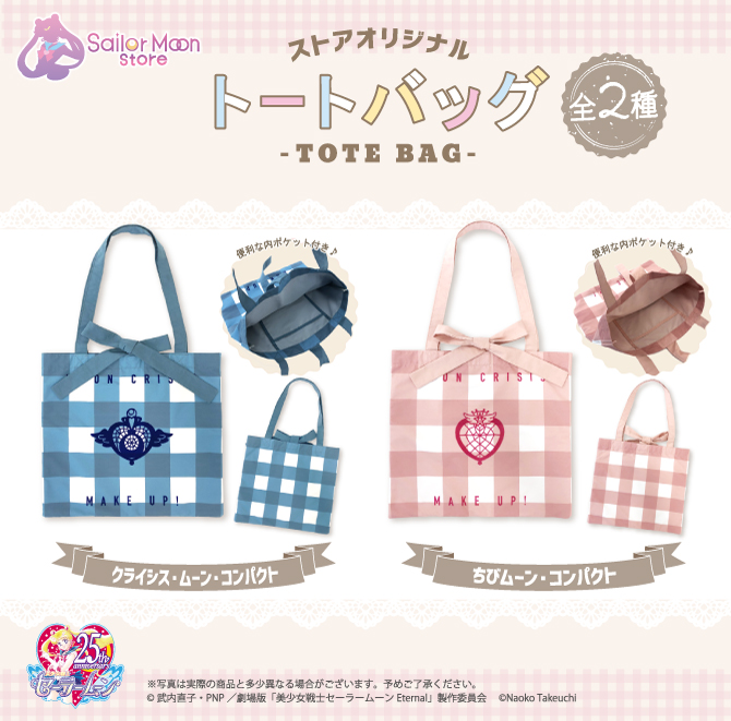 W Sailor Moon Store i Pretty Guardians pojawią się torby zakupowe w kratkę. Do wyboru są 2 wzory: niebieski z broszką Crisis Moon Compact oraz różowy z broszką Chibi Moon Compact. Na każdej jest napis "On Crisis Make Up!", napis i broszka zrobione