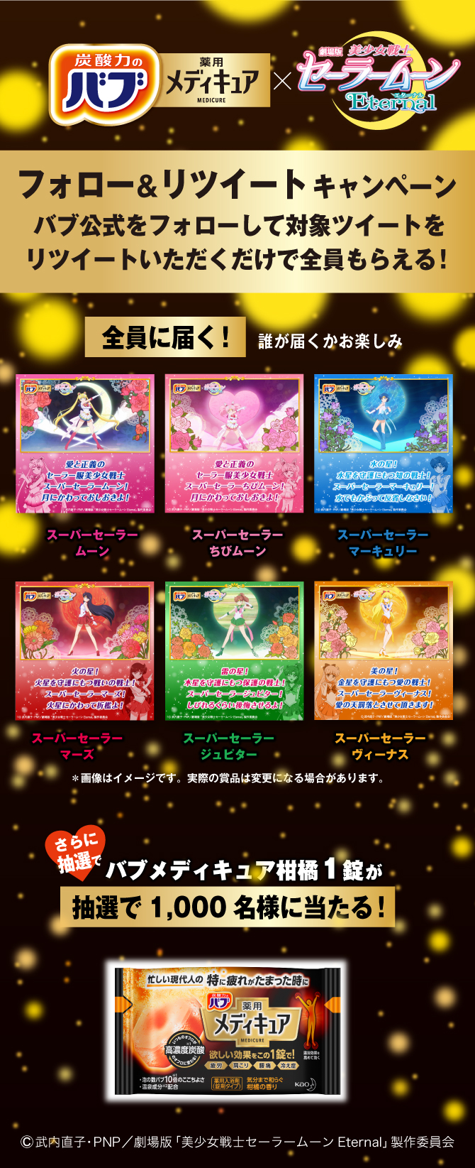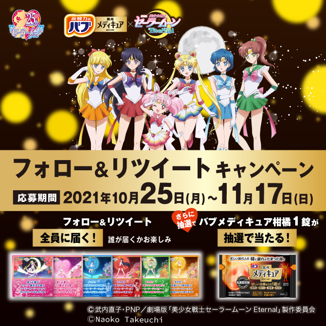 We współpracy z Bub Medicure pojawią się kampanie z nagrodami. Pierwsza kampania to kampania Twitterowa, która będzie trwać od dzisiaj do 17 października. Aby wziąć w niej udział, należy śledzić oficjalne konto "https://twitter.com/bub_jp", w poście poświęconym kampanii należy wybrać jeden z przycisków z nagrodami: szlafrok, szlafrok dla dzieci, plakat kampanijny lub mydełka. W dalszej części należy przytoczyć swój ulubiony cytat z filmów Eternal i opublikować post. Do wygrania jest po jednej sztuce szlafroków w kolorach inner senshi i Chibi Moon, ten ostatni jest szlafrokiem dziecięcym, oraz po 100 sztuk plakatów kampanijnych i zestawów mydełek inspirowanych Luną i Artemisem. Zwycięzcy zostaną ogłoszeni w połowie października, a nagrody rozesłane pod koniec października. Na później planowana jest kolejna kampania, ale nie podano na razie żadnych szczegółów.