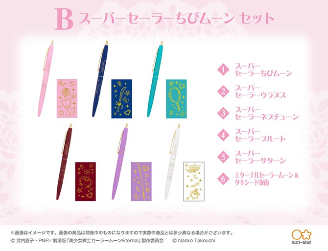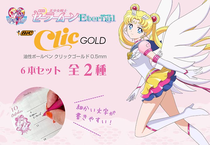 Ze wzorami z filmów Eternal pojawią się długopisy z serii ClicGold od Bic. Długopisy mają końcówkę w rozmiarze 0,5 mm i do kupienia będą w dwóch zestawach po 6 sztuk, co daje w sumie 12 różnych wzorów. W zestawie A znajdują się wzory inspirowane inner senshi oraz Luną, a w zestawie B wzory inspirowane Chibi Moon, outer senshi oraz Eternal Sailor Moon i Tuxedo Kamen. Długopisy będą dostępne poprzez Premium Bandai oraz w sklepach stacjonarnych. Przedsprzedaż rozpoczyna się dzisiaj, a wysyłka nastąpi pod koniec listopada. Cena za zestaw to 2640 jenów (ok. 91 zł).