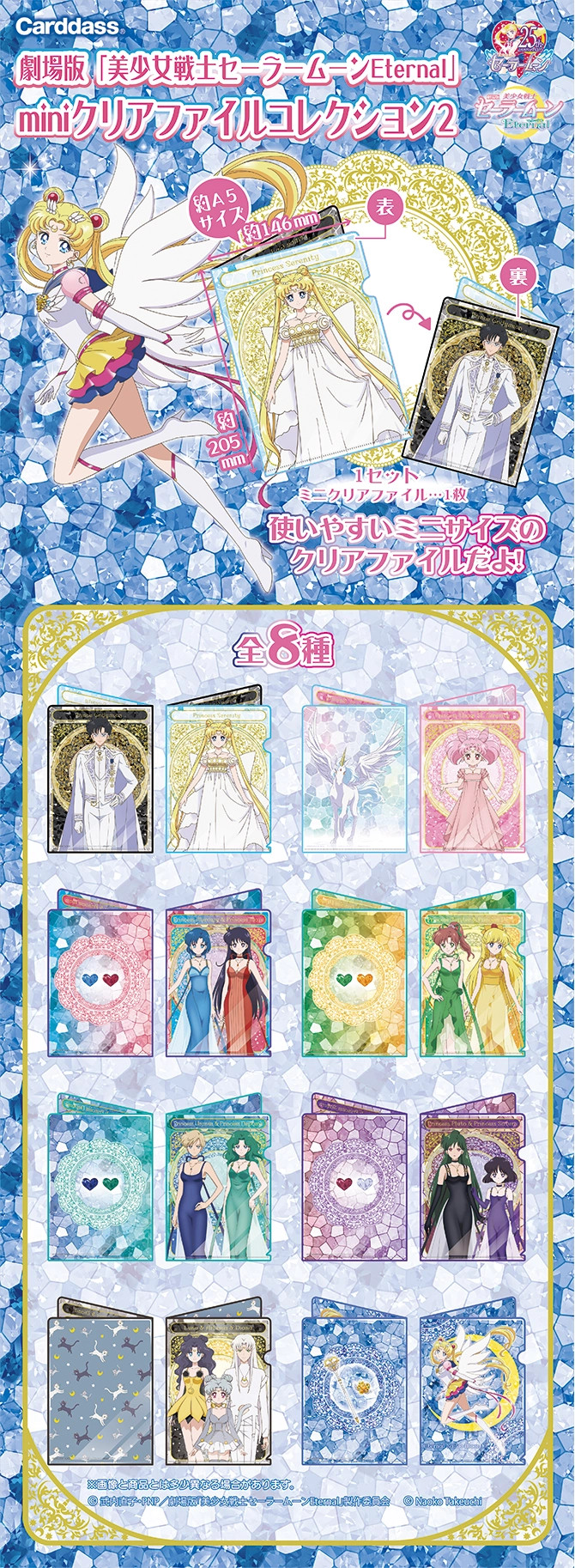 W automatach Jumbo Carddass pojawią się obwoluty formatu A5. Do uzbierania jest 8 wzorów: Księżniczka Serenity/Książę Endymion, Księżniczka Mała Dama Serenity/ Helios, Księżniczka Mercury/Księżniczka Mars, Księżniczka Jupiter/Księżniczka Venus, Księżniczka Uranus/Księżniczka Neptune, Księżniczka Pluto/Księżniczka Saturn, Luna/Artemis/Diana oraz Eternal Sailor Moon. Obwoluty będą dostępne w automatach w połowie grudnia w cenie 200 jenów za sztukę (ok. 7 zł).