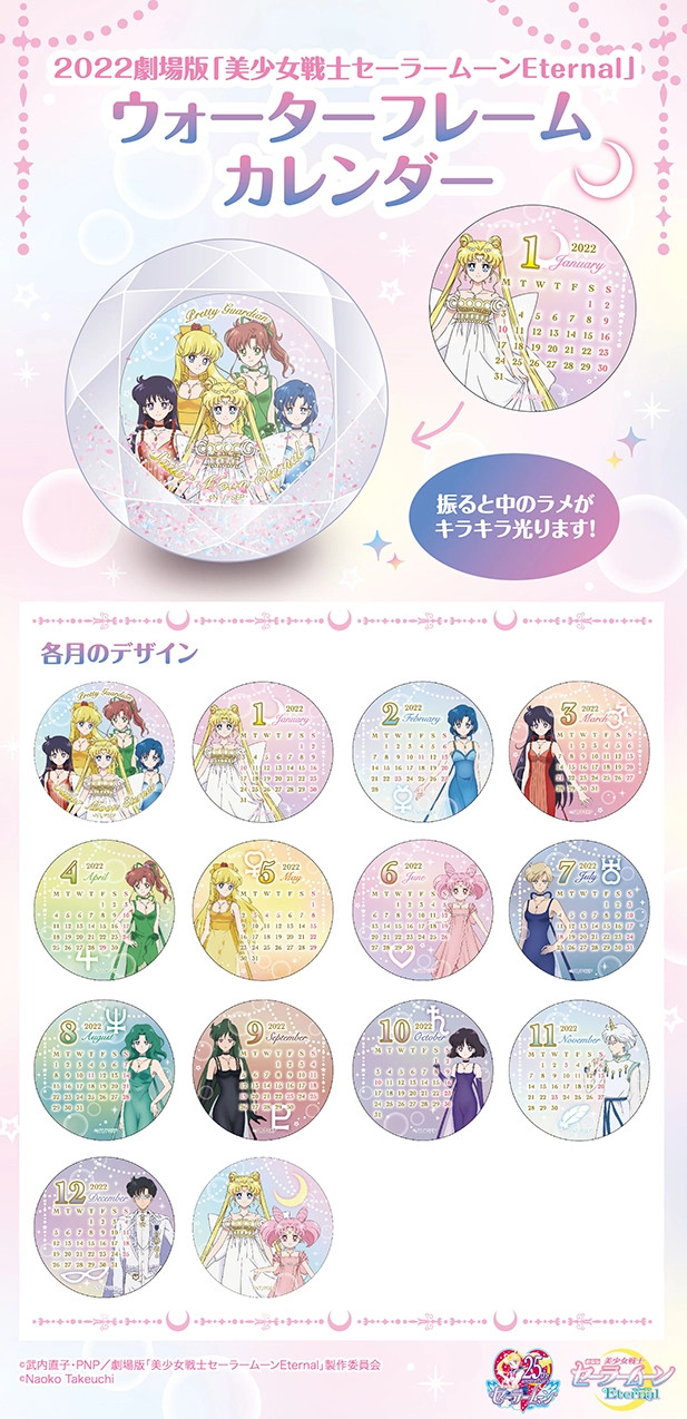 W Sailor Moon Store, Sailor Moon Store Petit i Pretty Guardians pojawi się kalendarz na 2022 w wodnej ramce. Przedsprzedaż rozpocznie się na początku listopada, dokładne daty zostaną podane na Instagramie i Twitterze oficjalnego sklepu oraz na stronie oficjalnego fanklubu. Sprzedaż i wysyłka rozpocznie się w połowie listopada. Kalendarz kosztuje 1980 jenów (ok. 71 zł).