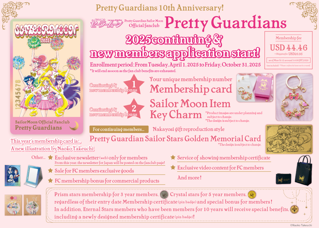Oficjalny fanklub świętuje 10. rocznicę i z tej okazji na karcie członkowskiej pojawiła się nowo narysowana ilustracja przez Naoko Takeuchi. Kolejny bonus dla zapisujących się do fanklubu lub przedłużających członkostwo to brelok z magicznymi przedmiotami Sailor Moon. Osoby przedłużające członkostwo otrzymają również reprodukcję dodatku do magazynu Nakayoshi z marca 1997 roku, którym była złota karta kolekcjonerska z Usagi, Chibiusą i Chibi Chibi. Członkowie kontynuujący członkostwo przez okres 3 lat otrzymają srebrną odznakę, członkowie, którzy kontynuują członkostwo przez 5 lat, otrzymają złotą odznakę, a członkowie, którzy należeli do fanklubu przez całe 10 lat otrzymają odznakę z broszką Henshin Brooch.