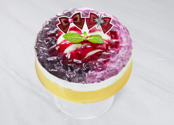 Saturn Shinrai no Kizuna Pudding - budyń ozdobiony galaretką w kolorach Sailor Pluto i Saturn; 1700 jenów (ok. 40 zł).