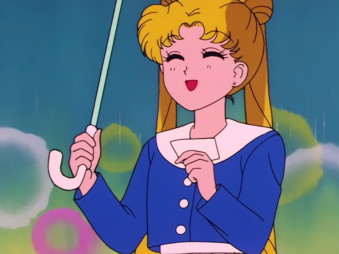 Usagi i Naru stoją przed sklepem jubilerskim rodziny Naru i żegnają siE. Na zewnątrz pada deszcz. Usagi idzie dalej ulicą razem z Luną i zatrzymuje się przed salonem gier. Ma ochotę trochę pograć, ale Luna upomina ją, że nie powinna