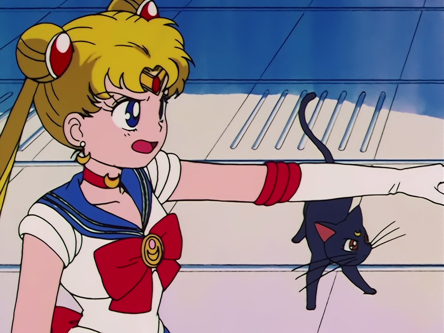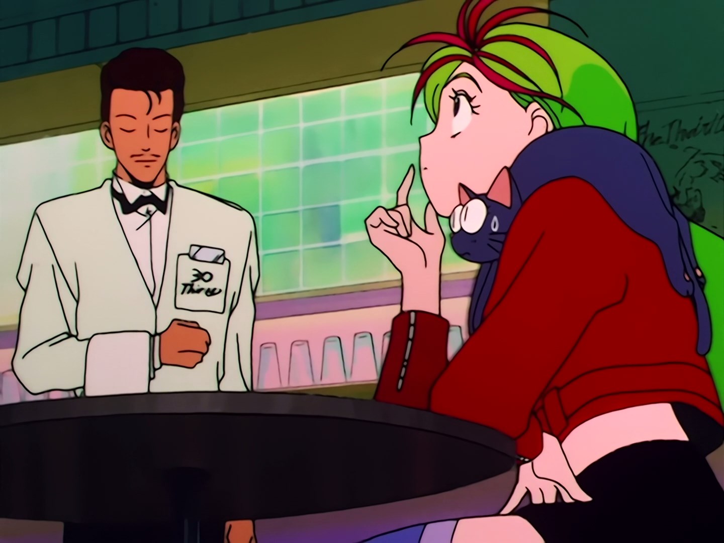 Usagi dostaje się do środka i siada przy jednym ze stolików. Udaje jej się przemycić również Lunę, która wisi jej na ramieniu i udaje ozdobę przy kurtce. Do stolika podchodzi kelner i pyta ją czego by się napiła. Usagi najpierw