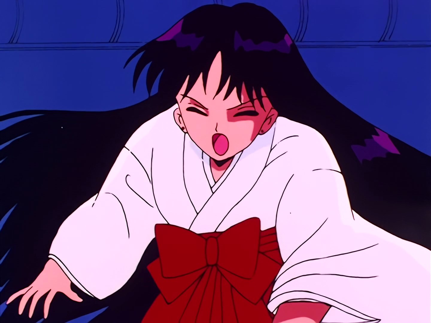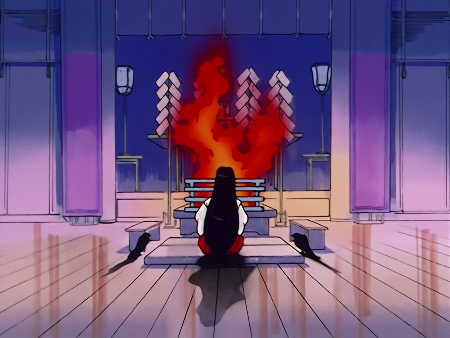 W pomieszczeniu świątynnym nad rozpalonym ogniem medytuje kapłanka Rei. Wyczuwa, że niedługo wydarzy się coś złego.