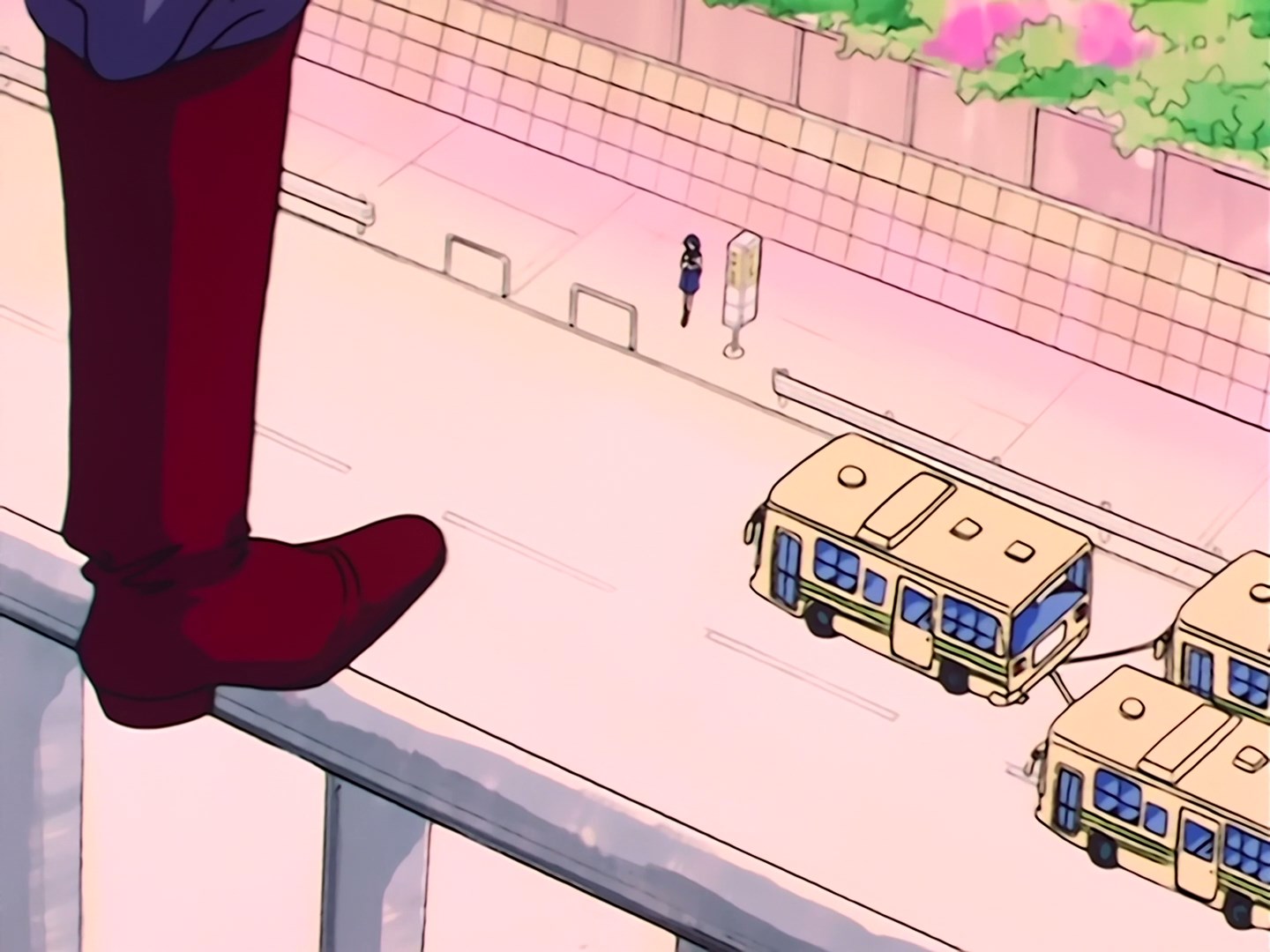 nadjeżdża autobus. Kierowca zatrzymuje go na przystanku, a do środka wchodzą uczennice. Ami próbuje nakłonić Usagi do wejścia do autobusu, ale dziewczyna boi się i nie chce wejść do środka. Drzwi zamykają się i autobus odjeżdża, a