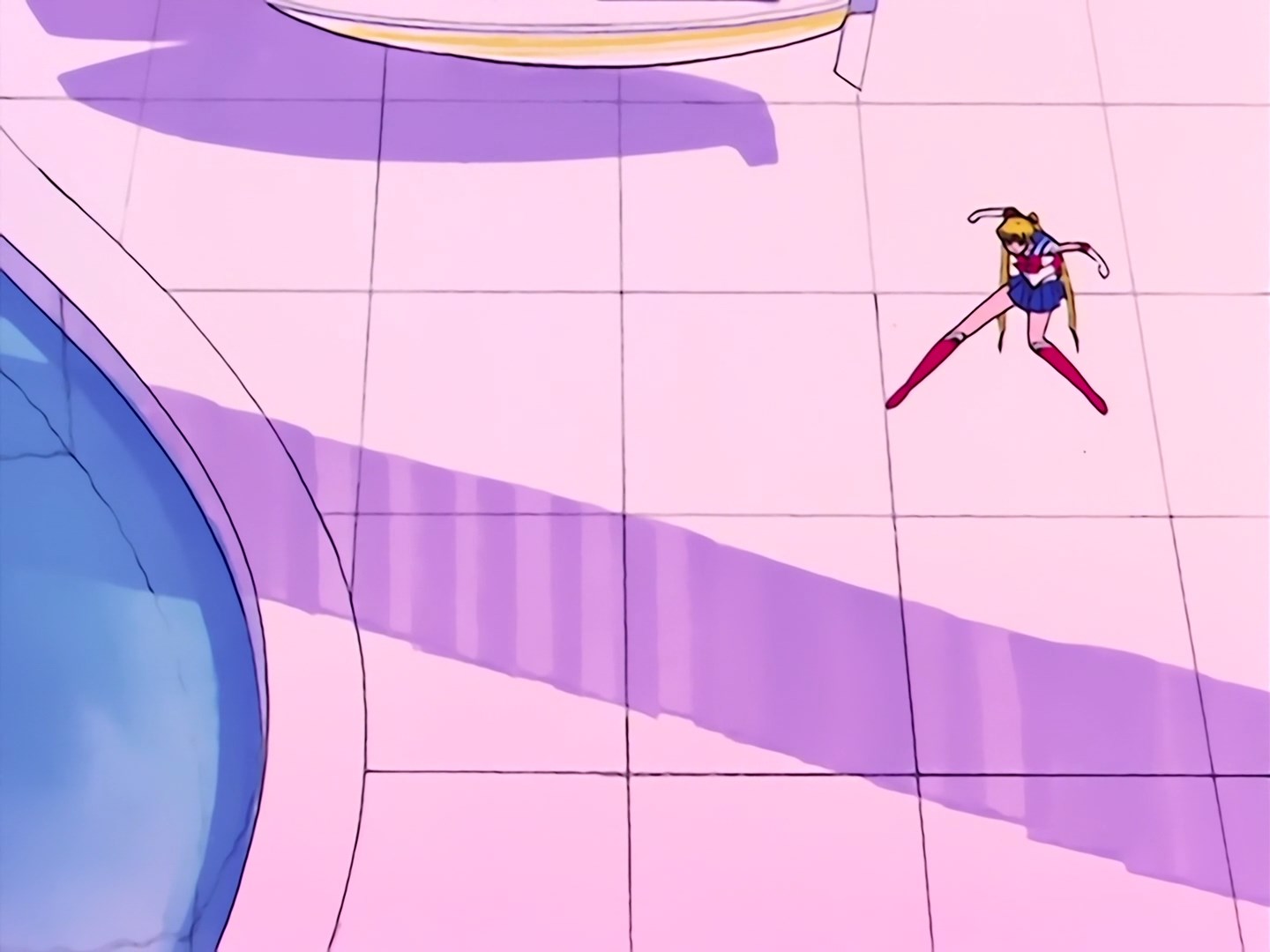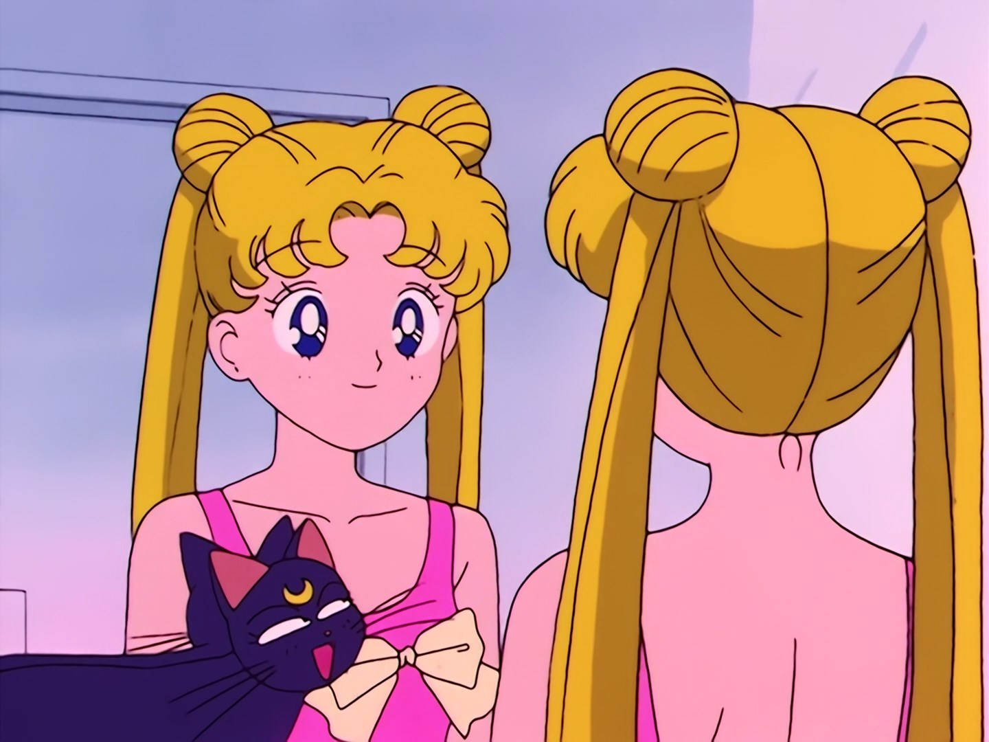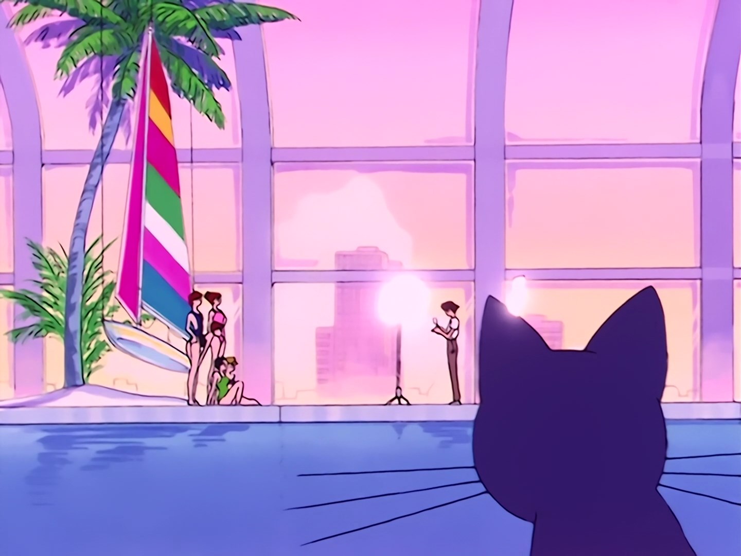korytarz, aby powiadomić za pomocą Komunikatora Ami i Rei. Nie zamierza jednak rezygnować z sesji zdjęciowej. Aby ją powstrzymać, Luna zrywa jedną z kokardek na jej kostiumie kąpielowym. Usagi jest wściekła i goni za Luną. Obie dobiegają