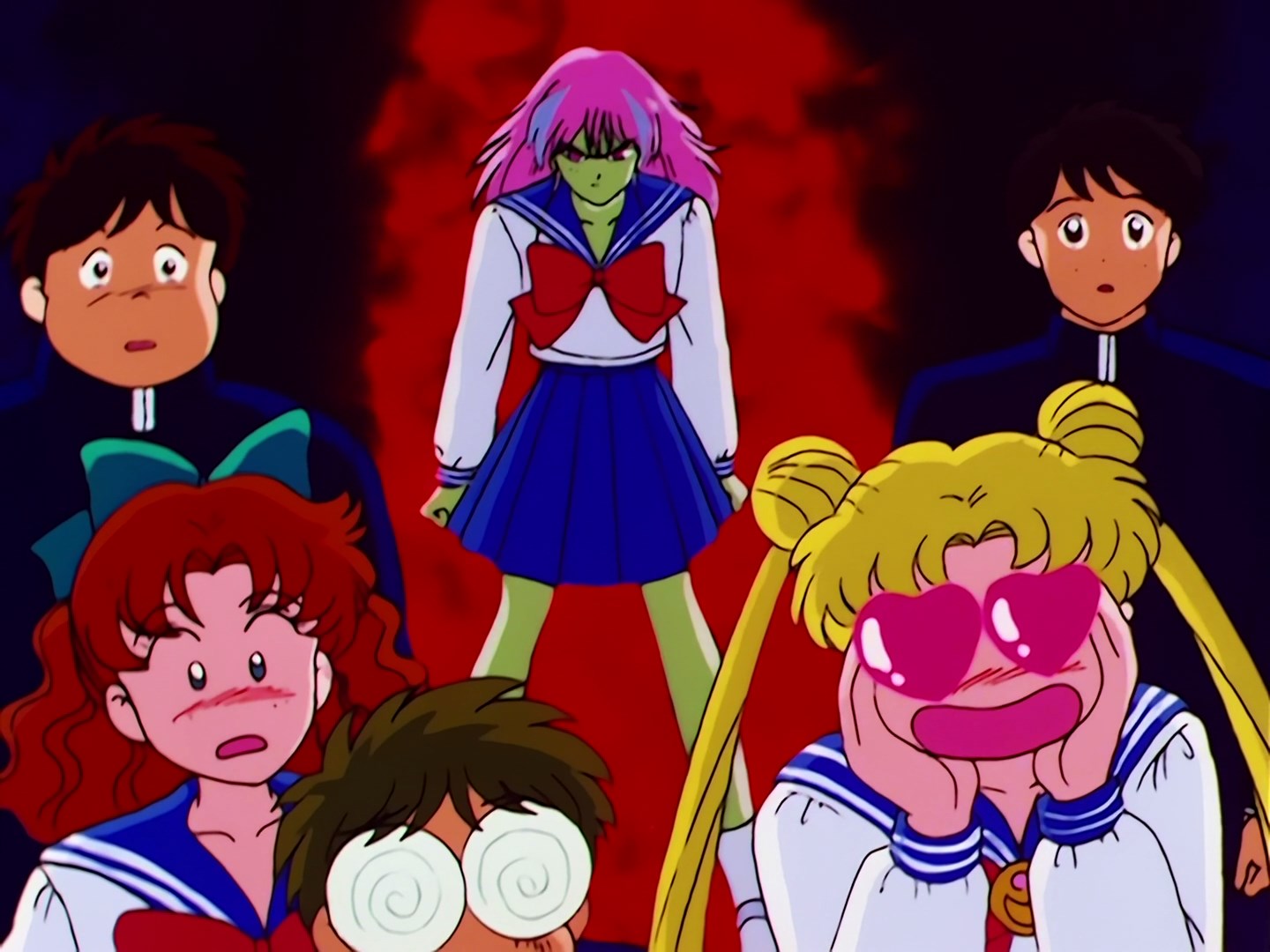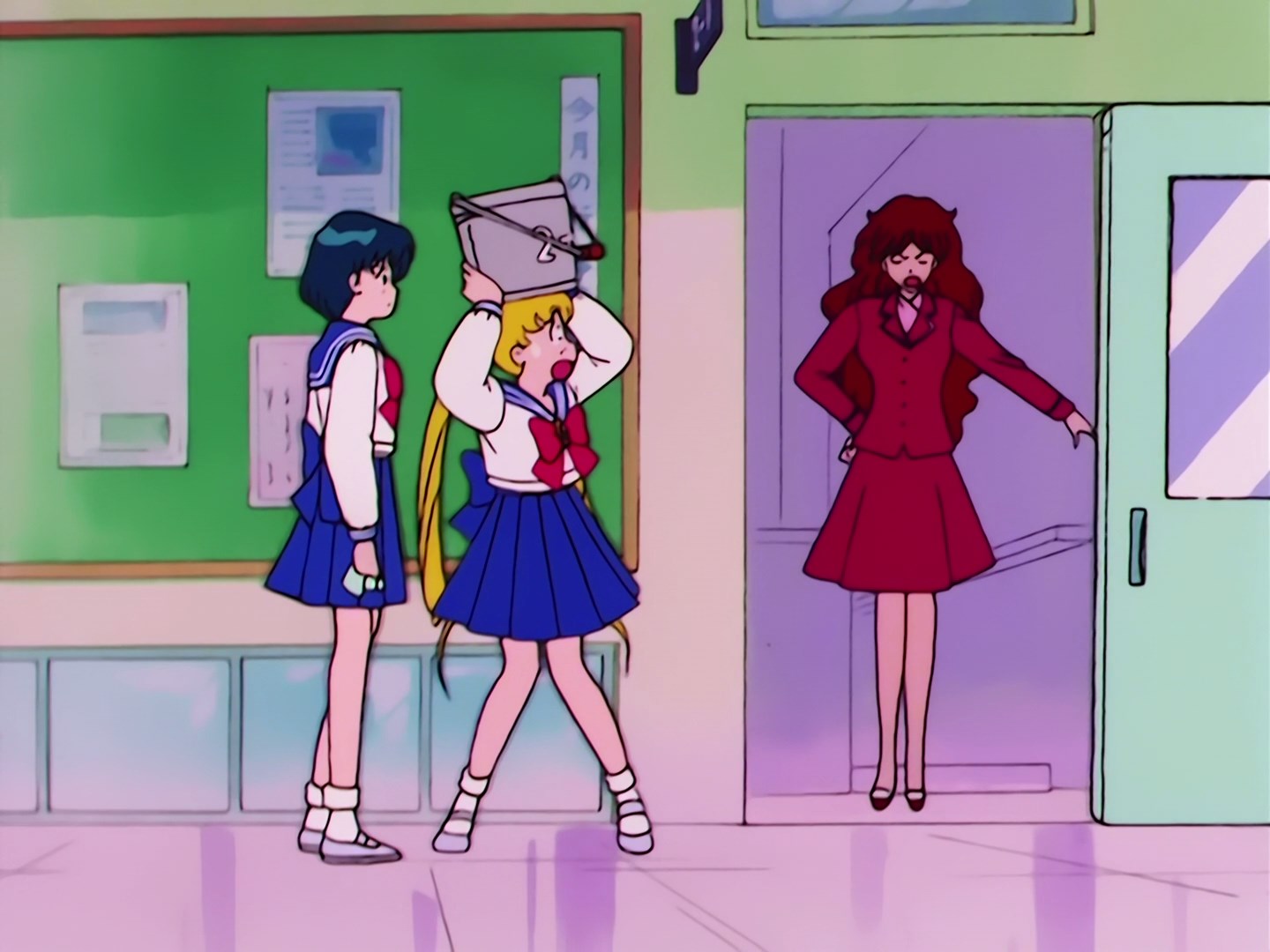 W szkole Usagi stoi na korytarzu z wiadrem na głowie, to jej kara za spóźnienie. Z klasy obok wychodzi Ami i ociera jej łzy. Usagi żali się, że chciałaby, aby jej nauczycielka była trochę bardziej łaskawa, tak jak Ami. Niestety