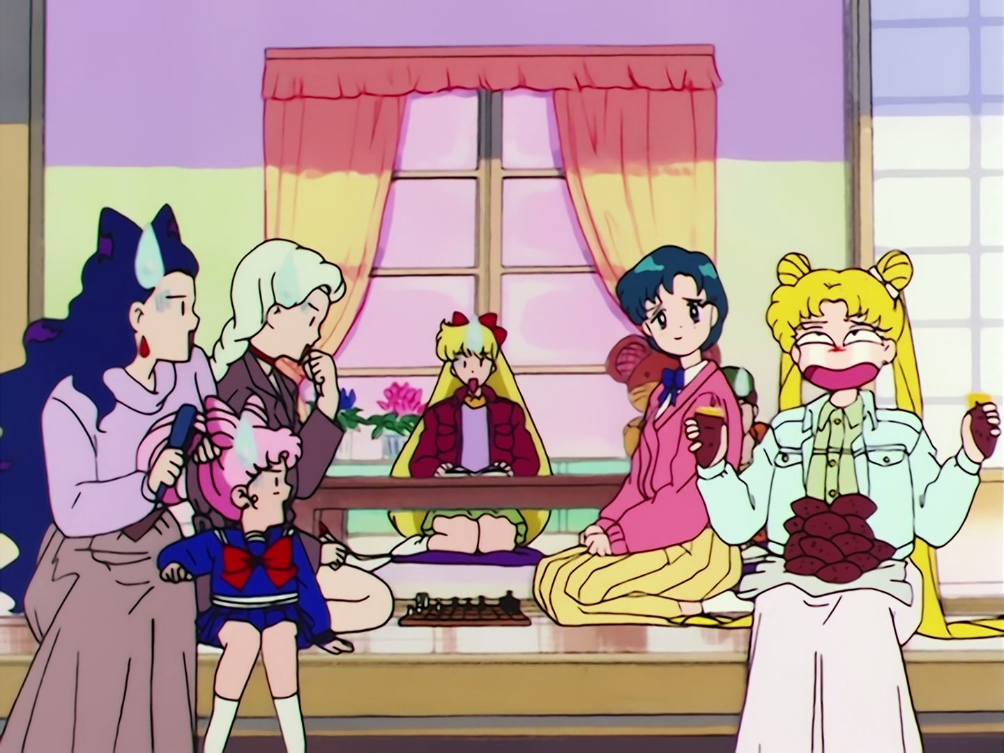 Dziewczyny dalej siedzą w Świątyni, zajadają się batatami i grają w szachy. Ogólnie miło spędzają czas przy dbaniu o urodę i czytaniu książek. Większość batatów oczywiście zagarnęła dla siebie Usagi, a Rei korzysta z okazji i