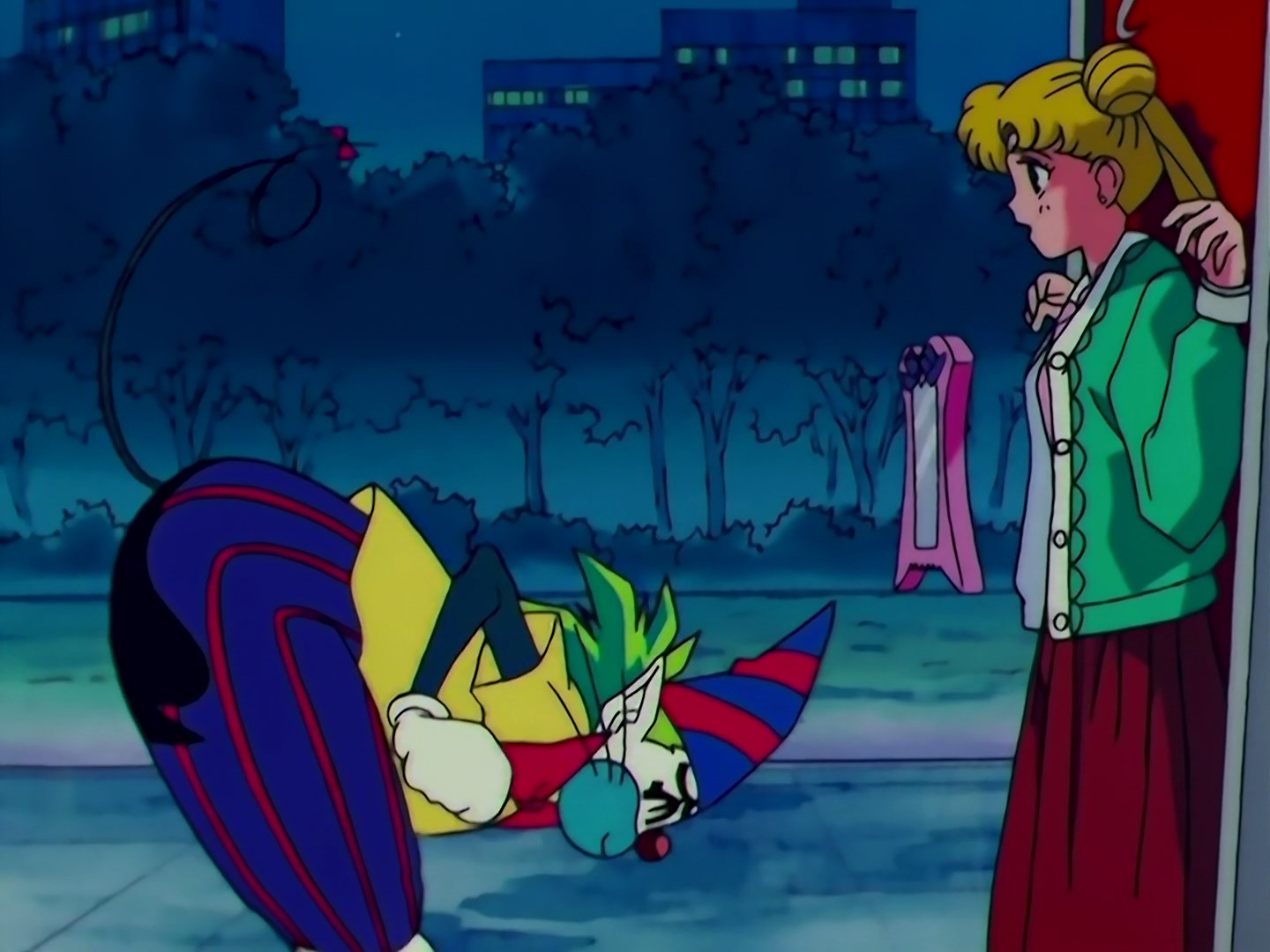 | Postacie występujące w odcinku: | Fish Eye, Usagi, Chibiusa, Pegaz, Ikuko - mama Usagi, Tigers Eye, Hawks Eye, Zirconia, magiczny Pierrot - Lemur, Sailor Jupiter, Sailor Mercury, Sailor Venus, Sailor Mars. |