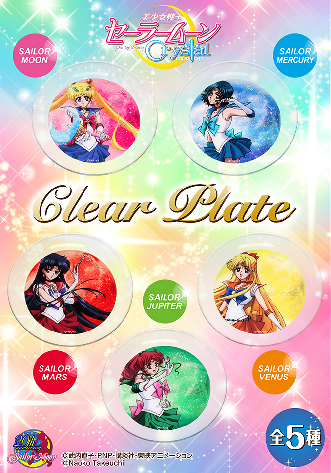 Półprzezroczyste talerze plastikowe ze wzorem z Sailor Moon Crystal. Do uzbierania 5 sztuk, każdy z inną inner senshi. Wymiary to 240 x 24 mm. Wytrzymałość na temperaturę od -20 do 100 stopni celsjusza. Cena za sztukę to 1620 jenów (ok. 45 zł). W sprzedaży ukazały się pod koniec listopada 2014. Produkowane przez Komorijushi.