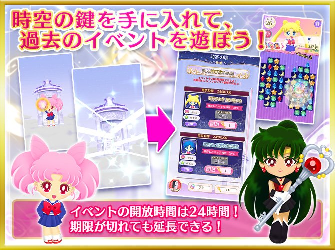 Pierwsza gra Sailor Moon na urządzenia przenośne (iOS i Android). Była to gra typowo Sailor Moon, a nie współpraca, gdzie postacie pojawiają się gościnnie w innych grach. Była to gra typu zbierz przynajmniej trzy klocki tego samego rodzaju w jednej linii.