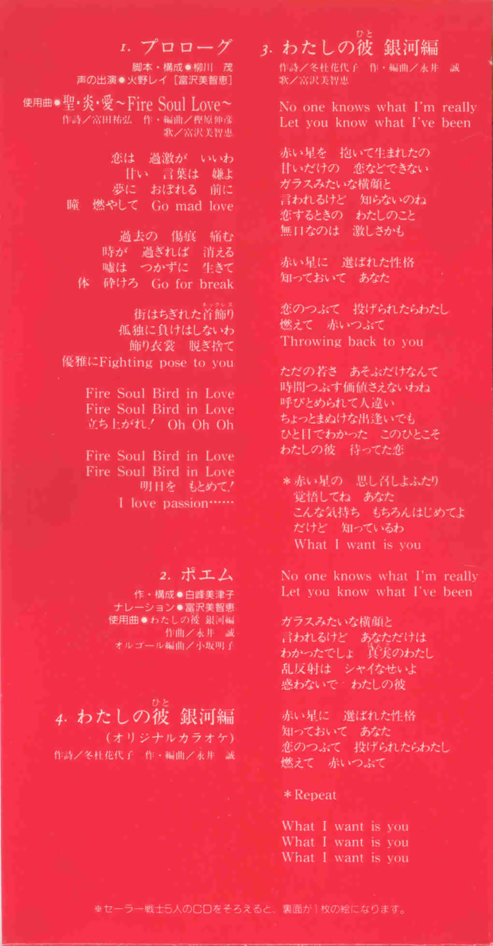 Jeden z pięciu singli z piosenkami poszczególnych bohaterek, kiedy złoży się je razem, tylne okładki ułożą się w jeden obraz. Płyta zawiera prolog i poemat, a także piosenkę w wersji zwyczajnej i karaoke. W trakcie prologu w tle leci piosenka, również śpiewana przez Sailor Mars: Sei Hi Ai ~Fire Soul Love~.