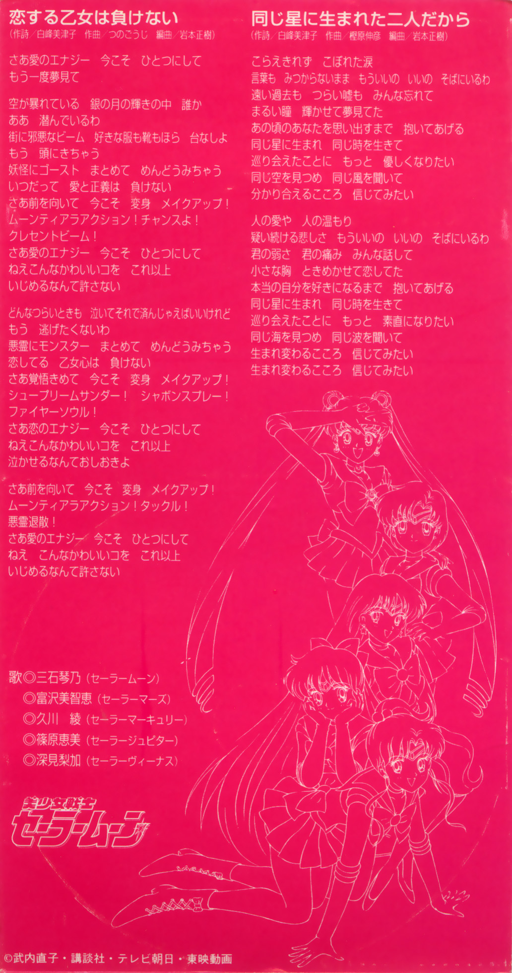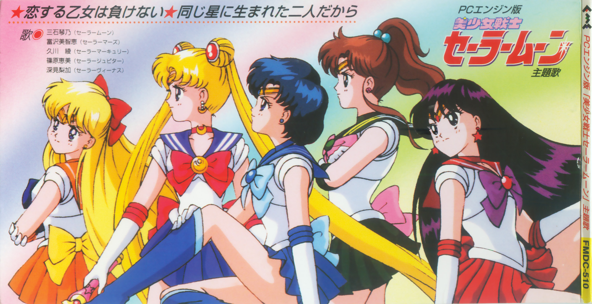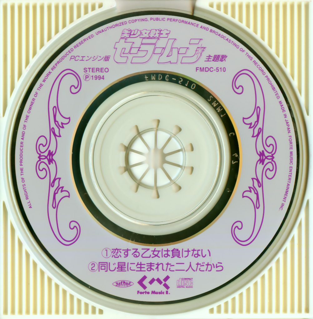 PCエンジン版 美少女戦士セーラームーン 主題歌 恋する乙女は負けない/同じ星に生まれた二人だから PC Engine ban Bishoujo Senshi Sailor Moon Shudaika Koisuru Otome wa Makenai / Onaji Hoshi ni Umareta Futari Dakara Piękna wojowniczka Sailor Moon, motywy przewodnie: edycja PC Engine. Zakochana dziewczyna nigdy się nie poddaje / Bo oboje urodziliśmy się na tej samej planecie. |