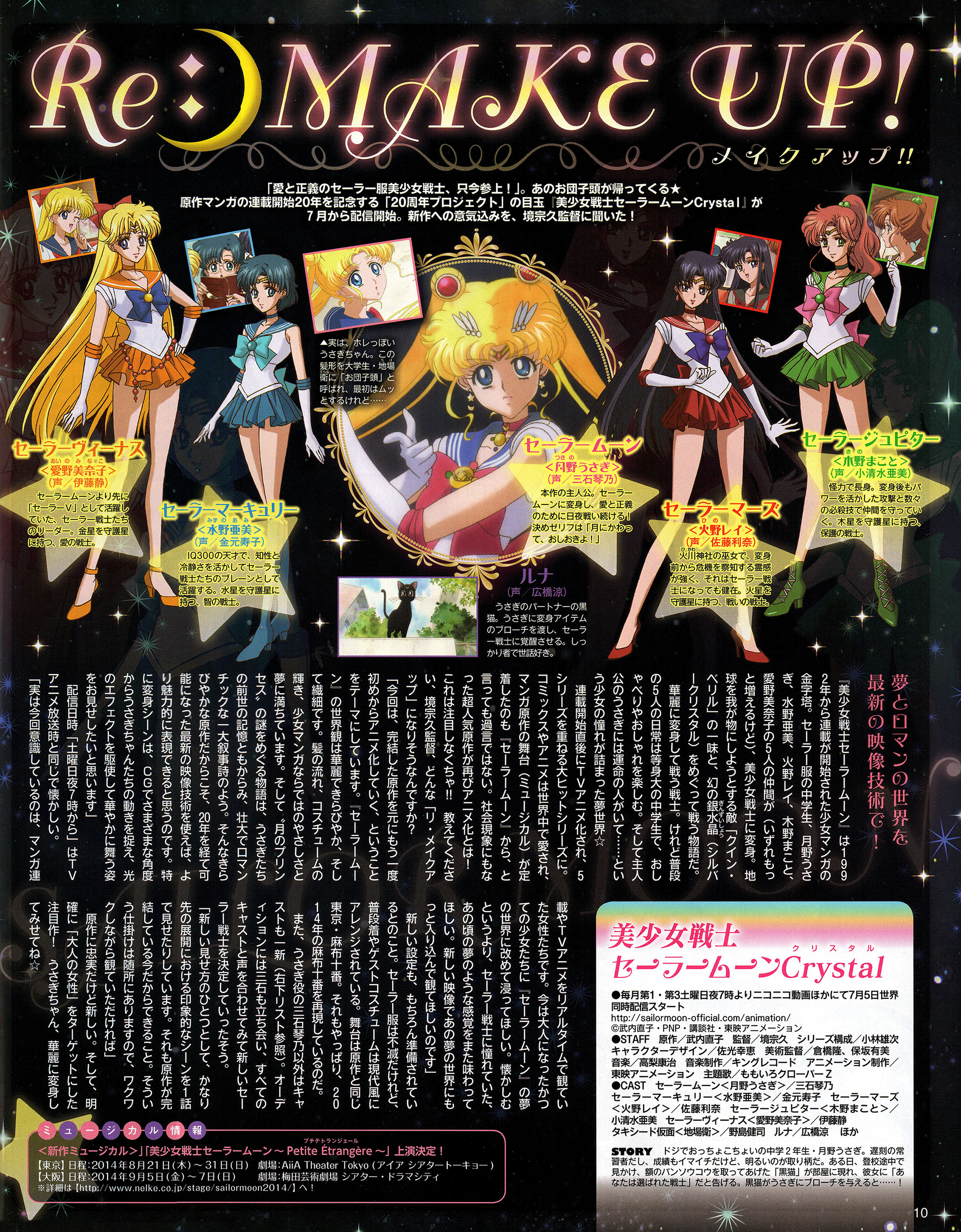 Dzisiaj pojawił się pierwszy trailer nowej serii Sailor Moon Crystal. Piosenka śpiewana przez Momoiro Clover Z, która będzie nowym openingiem, nosi tytuł Moon Pride. Już zapowiedziano wydanie CD+Blu-ray. Lunie będzie podkładać głos Ryo Hirohashi, a Mamoru