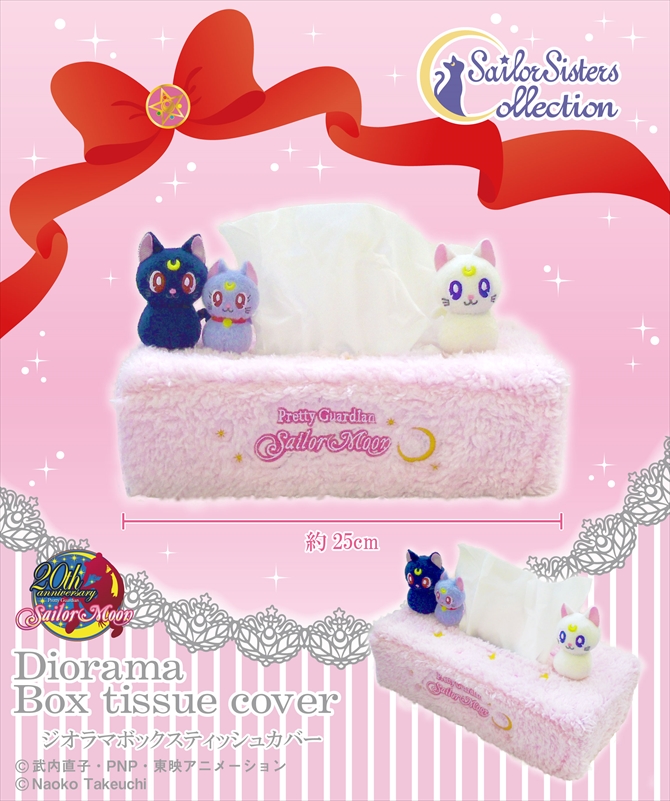 Pokrowiec na pudełko od chusteczek z małymi figurkami Luny, Artemisa i Diany. Puchaty i różowy. Pasuje na pudełko długości 25 cm i kosztuje 2400 jenów (ok. 74 zł). Wydanie planowane na listopad 2014.
