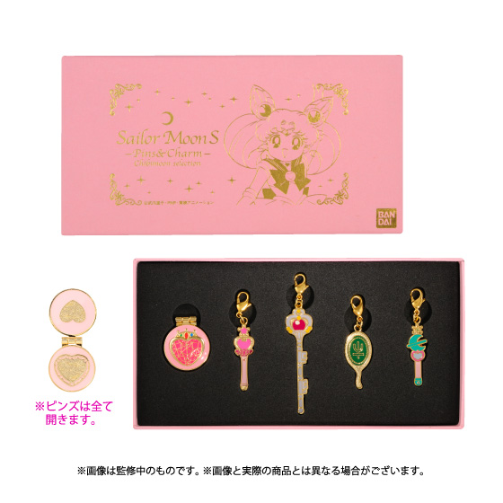 seriom R, S (dwa zestawy, jeden poświęcony Sailor Moon, a drugi Sailor Chibi Moon) i Super S. W sumie w zestawach znajdzie się 6 przypinek, które są broszkami do przemiany i otwierają się oraz 14 zawieszek. Przy zakupie pełnego zestawu