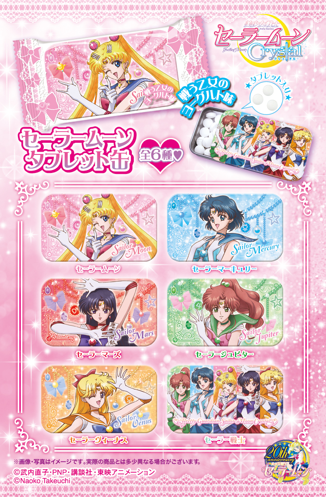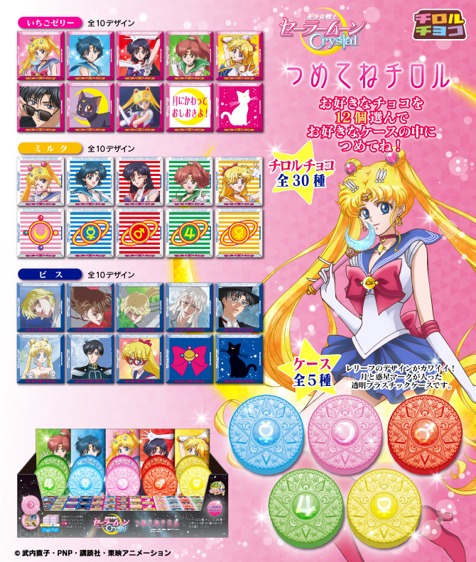 W sprzedaży pojawiły się czekoladki w papierkach z postaciami z Sailor Moon Crystal. Dostępne są trzy smaki: z truskawkową galaretką, z mlecznej czekolady i z biszkoptem. Z każdego smaku jest 10 wzorów do wyboru. Cena za sztukę to 600 jenów (ok. 19 zł).