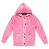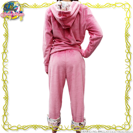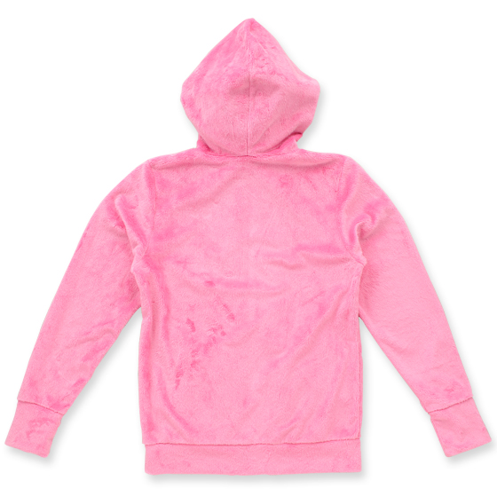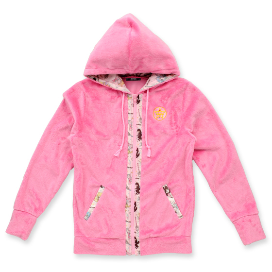 Różowa pluszowa bluza z kapturem. Na zewnątrz jest jednokolorowa, a podszewka jest biała z nadrukiem z wojowniczkami. Rozmiar to damskie M, materiał to poliester, cena to 9245 jenów (ok. 281 zł).