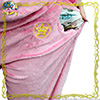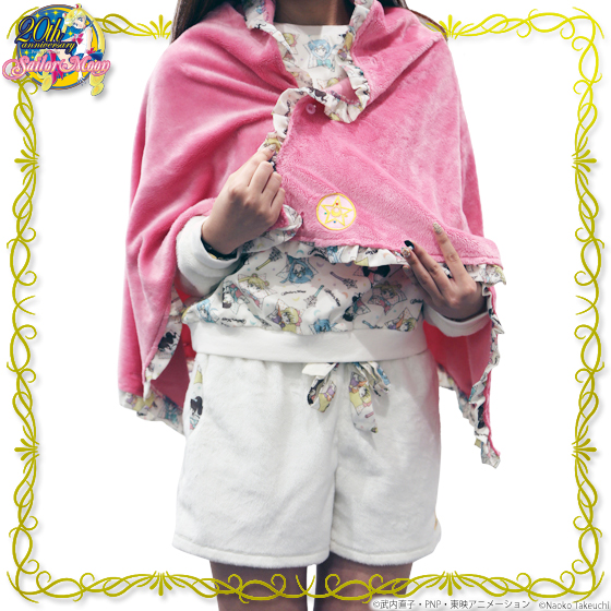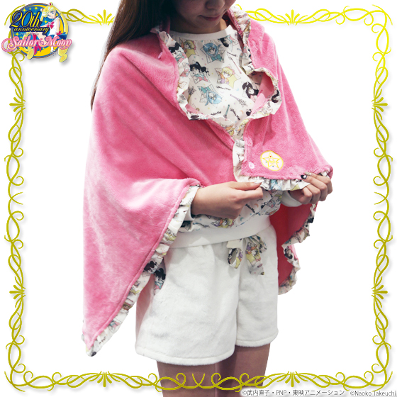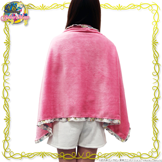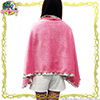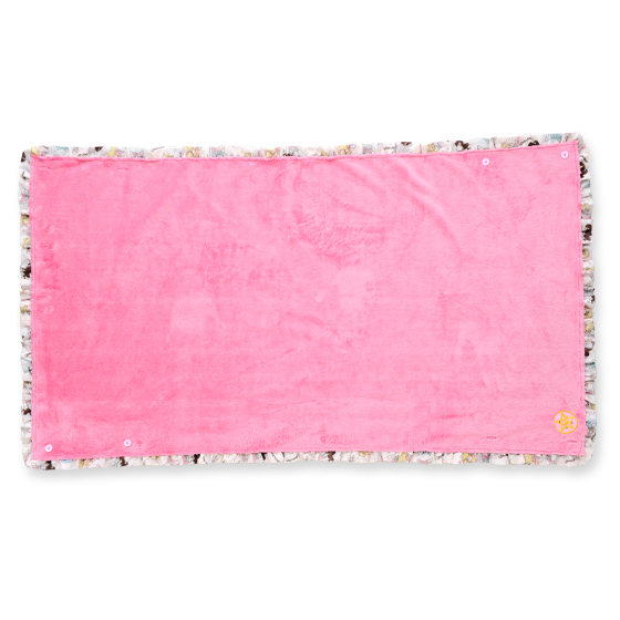 Różowy pluszowy kocyk z białą falbanką dookoła i zatrzaskami. Kocyk ma wymiary 135 x 68 cm i można go używać jako okrycia wierzchniego (właśnie po to są zatrzaski). Cena to 3780 jenów (ok. 115 zł).