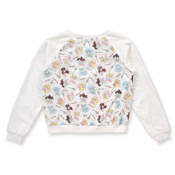 Biała pluszowa bluza bez kaptura z nadrukiem z wojowniczkami. Rozmiar damski M, materiał poliester, cena 7020 jenów (ok. 213 zł).