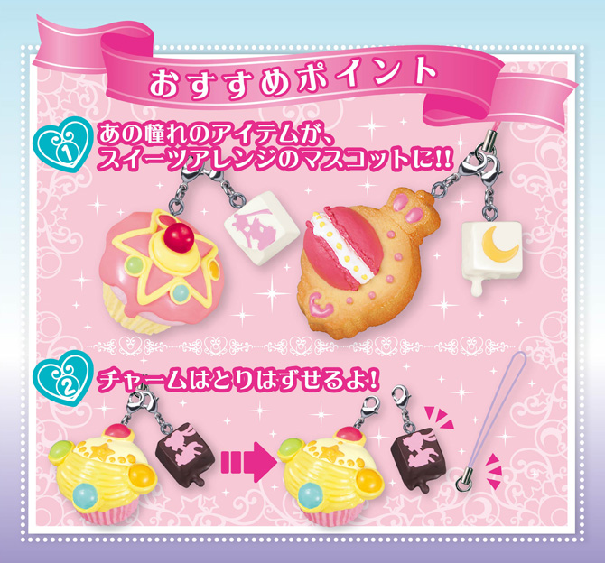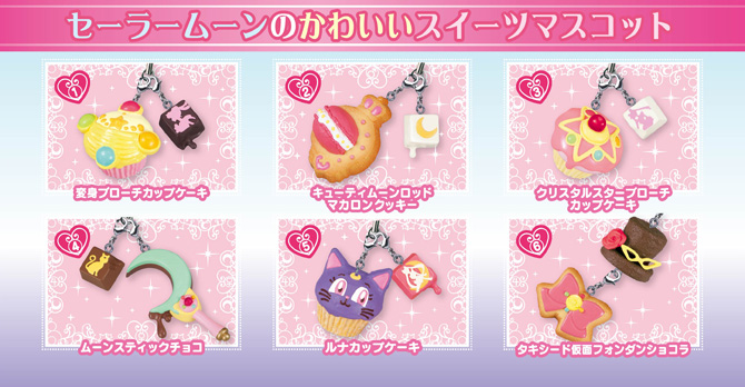 Dostępnych jest 6 różnych zawieszek tematycznie powiązanych z Sailor Moon, ale wszystkie przedmioty na zawieszkach są stylizowane na słodycze. Poszczególne elementy są dopinane na karabińczykach, więc można je łączyć w dowolne zestawy. Zawieszki pojawią