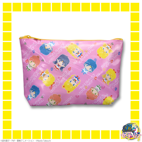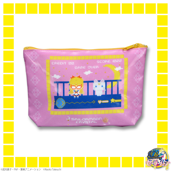 Laminowana kosmetyczka, wymiary to 195 x 120 x 40 mm, kolor różowy, z jednej strony nadruk z wojowniczkami, z drugiej kadr z gry Sailor V. Cena to 1296 jenów (ok. 40 zł).