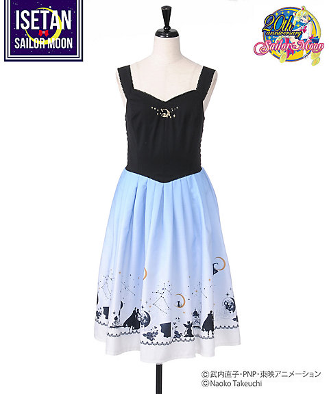 1. Gradient Print Dress - cena: 20520 jenów (ok. 657 zł); kolor: czarno-niebieska; długość: 98 cm; sukienka na szerokich ramiączkach z nadrukiem inspirowanym Srebrnym Milenium i konstelacjami.