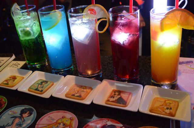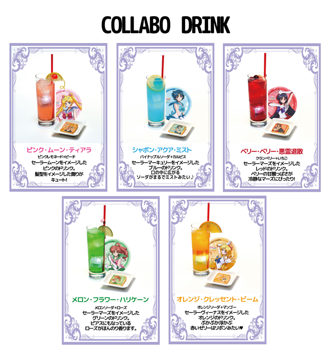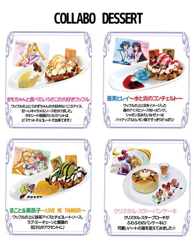 (napój powiązany tematycznie z Tuxedo Kamen ozdobiony małą różyczką) oraz Crystal Power Makeup Tea (jest to napój zmieniający kolor z fioletowego na różowy po dodaniu cytryny). Desery będą kosztować 3900 jenów (ok. 121 zł) za makaronik